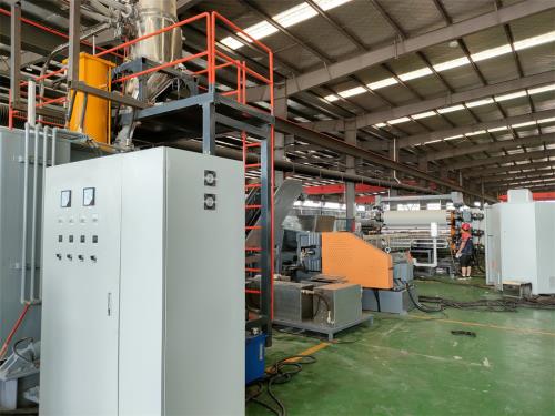 出料有效寬度1300mm;制品寬度1200mm;制品厚度1-4mm,模頭材料:P20鋼材,采用不銹鋼加熱棒;模頭流面鍍硬鉻處理。(六)三輥壓光機JDL-1500 《一套》1、機架采用型鋼焊接而成,有較高的鋼性。整個機架由兩件墻板、頂聯(lián)接板及底座組成,各安裝面均經(jīng)過機械加工,以確保安裝精度。形式:直立式2、減速箱、電動機本機采用輥筒獨立傳動,每個輥筒軸端均配有一傳動減速箱,傳動平穩(wěn)、噪音低、效率高,結構緊湊。電動機采用交流變頻電機,功率:1.5kw×3臺;三輥線速度為0-6米分鐘3) 輥筒1) 輥筒直徑:上輥φ400mm /中輥φ400mm(網(wǎng)格紋)/下輥φ400mm,輥面寬度1500mm2) 輥筒控溫水進出口徑:11/4”輥筒圓度:0.005mm,輥筒同軸度:φ0.012mm,輥筒表面粗糙度:Ra0.025μm,輥筒外圓表面淬硬HRC55~60,淬硬深度3~5mm;輥筒表面鍍硬鉻,t=0.08~0.103)一步成型片材擠出機 輥筒壁厚:50mm,輥筒軸承組:采用日本NSK耐高溫雙列圓柱滾子調(diào)心軸承,軸承座:結構為剖分式,以便快速更換輥筒。上蓋上開潤滑孔,方便維護。4、輥筒調(diào)距裝置1) 輥筒上下采用電動渦輪蝸桿升降。微調(diào)為手動,并兩端可單獨調(diào)節(jié),調(diào)節(jié)范圍0-70mm,2) 輥筒間隙調(diào)整采用絲桿結構,手動微調(diào),微調(diào)范圍:1-5mm,刻度盤指示5、移動組件1) 整個移動組件由傳動系統(tǒng)、滾輪升降組件等組成, 傳動電機功率:0.37kw,采用雙級減速器傳動,移動平穩(wěn),亦可手動微調(diào)2) 二輥前后移動導軌要求長度為:2500mm;導軌上要有預留固定孔;方便在客戶現(xiàn)場安裝膨脹螺絲(七)下放卷裝置(熱腹合無紡部裝置) 一步成型片材擠出機 雙工位1)下放卷安裝與托架下; 雙工位放卷; 放卷速度采用磁粉控制;下放卷架子與三輥底座為螺絲連接;與三輥能同步前后移動; 在最下面三輥的支架安裝個托架的支架;防止下放卷在放無紡布是不能與輥筒摩擦;(八)輥筒控溫裝置(一組/套)模溫機1) 輥筒的控溫由水溫控制箱來完成,最高控制油溫90℃ 2)水泵泵電機功率:0.75kw;自動控水電磁閥;手動閥用銅閘閥控制;加大水流量,3)采用環(huán)保風冷卻系統(tǒng)(環(huán)保型:發(fā)明專利號:CN201911312134.6)不需要接外循水冷卻,不用徘外水;采用閉環(huán)循環(huán)系統(tǒng)雙碗造粒機 http://www.45515.cn/contents/168/36.html
